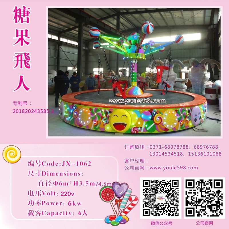 糖果飛人旋轉蹦床~是一款新型的游樂設備,結合兒童蹦極和超級蹦床的創(chuàng)新項目,全新升級彈跳蹦床,打破傳統(tǒng),360度自動旋轉,自由的彈跳和翻騰能夠提高兒童的肢體協(xié)調(diào)性、柔韌、上下肢運動力量等,讓孩子在快樂的彈跳中培養(yǎng)勇敢、自信、迎接挑戰(zhàn)的素質(zhì)。遙控控制,繩索高度自動調(diào)節(jié),操作方便,可同時六人游戲,營收可觀!