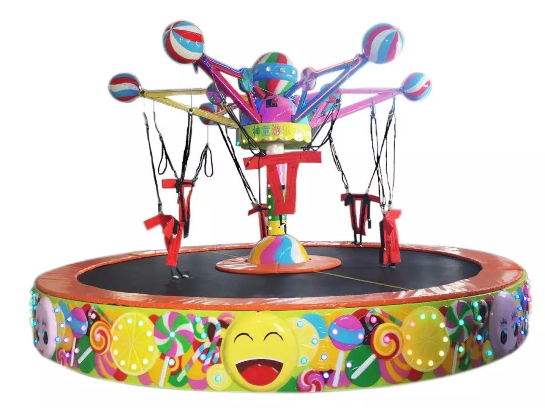 糖果飛人旋轉(zhuǎn)蹦床~結(jié)合兒童蹦極和超級蹦床的創(chuàng)新項目,全新升級彈跳蹦床,打破傳統(tǒng),360度自動旋轉(zhuǎn),自由的彈跳和翻騰能夠提高兒童的肢體協(xié)調(diào)性、柔韌、上下肢運動力量等,讓孩子在快樂的彈跳中培養(yǎng)勇敢、自信、迎接挑戰(zhàn)的素質(zhì)。遙控控制,繩索高度自動調(diào)節(jié),操作方便,可同時六人游戲,營收可觀!