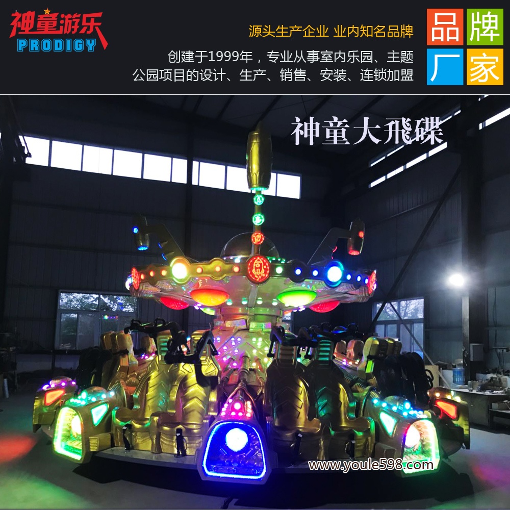 伴隨著激情歡樂的旋律,一搜承載著全人類太空探險之夢的新型宇宙飛船——神童大飛碟起航了,游樂場設備20座飛碟它穿越了神秘的空間,帶你走進神秘的外太空......遠方星光點點,混沌未開,航道曲折不定,游樂設施大飛碟上下起伏,旋轉搖曳,忽而急行,忽而停駐,行云流水般轉向掉頭,繞過不明天體,疾馳而去。